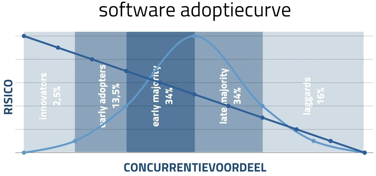 Kortom: de fase waarin jouw bedrijf zich bevindt, heeft een grote invloed op je concurrentiepositie en succes. Innovators en early adopters kunnen fikse concurrentievoordelen behalen door nieuwe technologieën snel te implementeren. Dit vereist echter aanzienlijke investeringen en het brengt de nodige risico's met zich mee. Aan de andere kant, bedrijven in de late majority en laggards nemen minder risico's, maar kunnen achterlopen op concurrenten die al profiteren van de nieuwste innovaties.